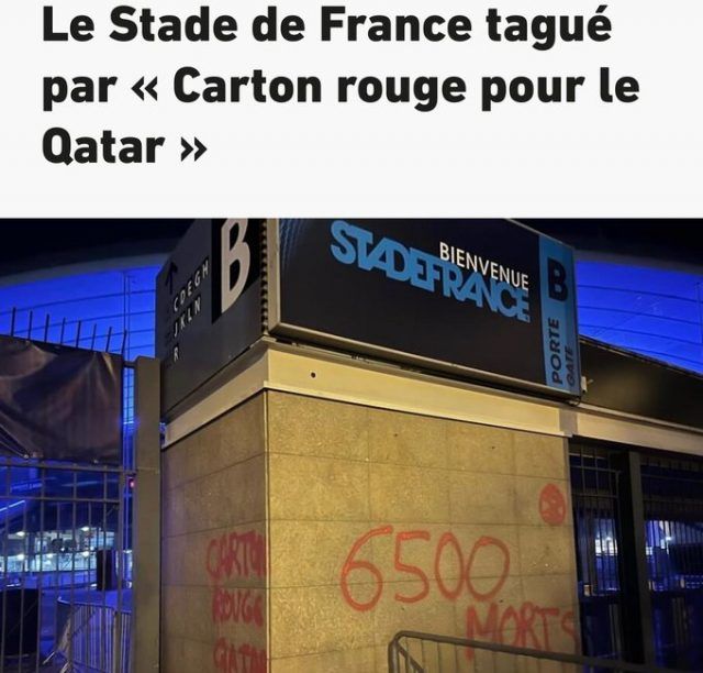 Le Stade de France a été tagué d’un message dénonçant les conditions dans lesquelles se déroulent les travaux au Qatar en vue de la Coupe du monde 2022, avant le match France-Croatie en Ligue des nations