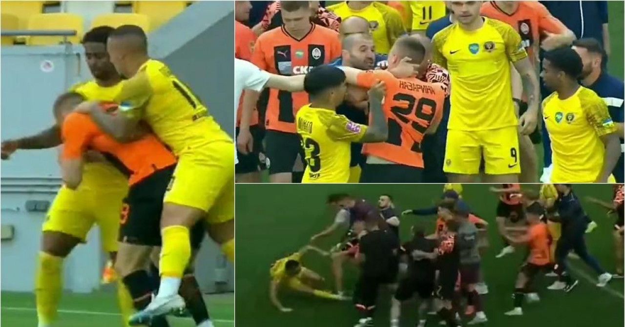 Yehor Nazaryna went for a tackle on João Peglow & it sparked a huge brawl between Shakhtar & Dnipro-1 players 🥊. pic.twitter.com/NXCsMHFsmy