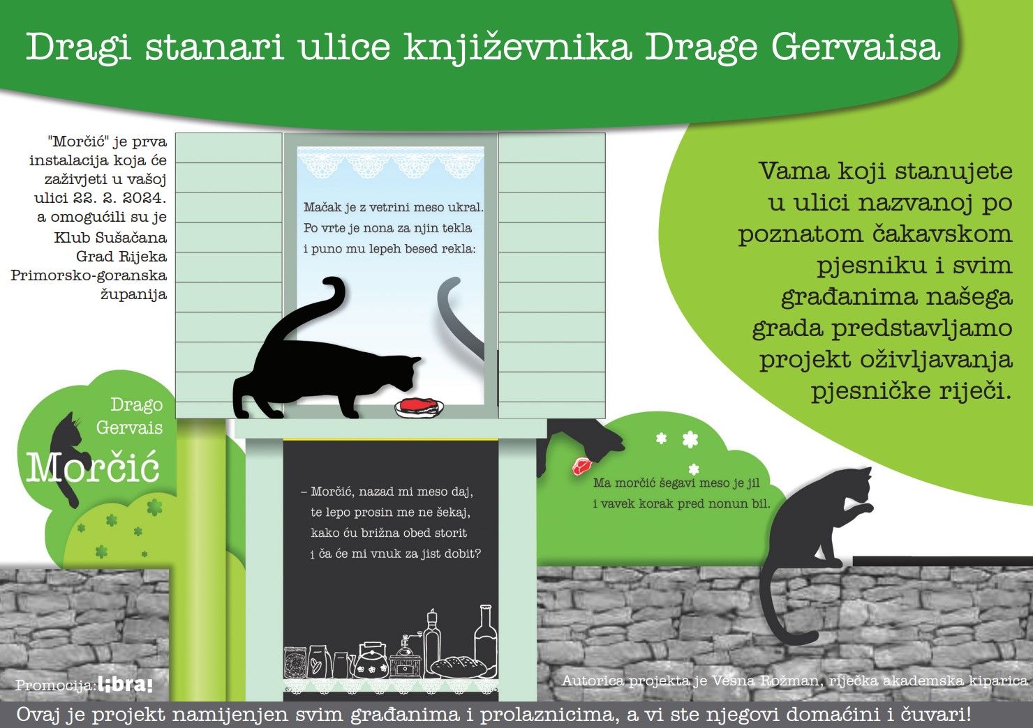 Zahvaljujući prihvaćenom projektu i odobrenim financijskim sredstvima od strane Odjela za kulturu Grada Rijeke, za nekoliko dana, u četvrtak 22. veljače 2024. godine u 12.00 sati, prisustvovat ćemo otvorenju prve umjetničke instalacije pod nazivom “MORČIĆ” koja će biti postavljena na javnoj površini pločnika ulice, uz postojeći ogradni zid ispred višestambene zgrade, točnije u Ulici Drage Gervaisa kod kućnog broja 14.