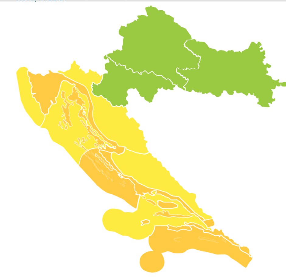 Stoga je za cijelu Hrvatsku izdan žuti meteoalarm koji upozorava na potencijalno opasno vrijeme. Sutra, kontinentalni dijelovi zemlje su pod zelenim alarmom, no za riječku regiju, Kvarner, Velebitski kanal i dijelove Dalmacije na snazi je narančasti alarm.
