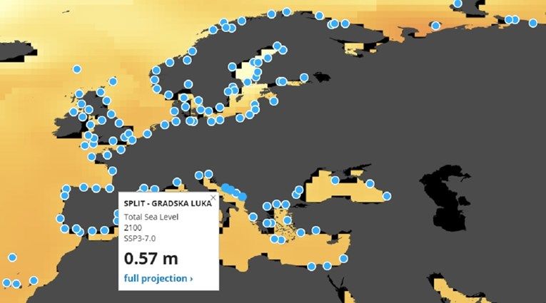 Prema karti predviđa se da će razina Jadranskog mora, ako se Zemlja nastavi zagrijavati brzinom kao dosad, do 2050. godine narasti za 20 centimetara, a do 2100. za oko 60 centimetara. Do 2150. godine razina mora bi u tom slučaju porasla za 98 centimetara.
