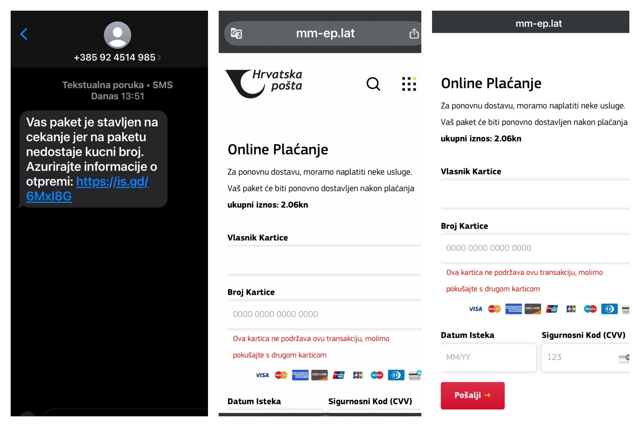 Lažne obavijesti mogu se prepoznati po sumnjivoj adresi (službena domena Hrvatske pošte je posta.hr), gramatičkim pogreškama te nejasnoj poveznici na kojoj se od primatelja u pravilu traži unos broja bankovne kartice i CVC/CVV broj. Samo jedan od navedenih elemenata dovoljan je kako bi se osporila valjanost poruke.