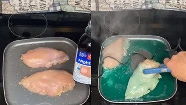 Jedan je gurman s “neobičnim” kuharskim i medicinskim sklonostima na TikToku pojasnio kako se spravlja “NyQuil piletina”. U videu on stavlja dvoja pileća prsa u tavu, prži ih na niskoj temperaturi, a zatim nalijeva gotovo cijelu bocu sirupa za kašalj i pušta piletinu da se “krčka” pola sata.