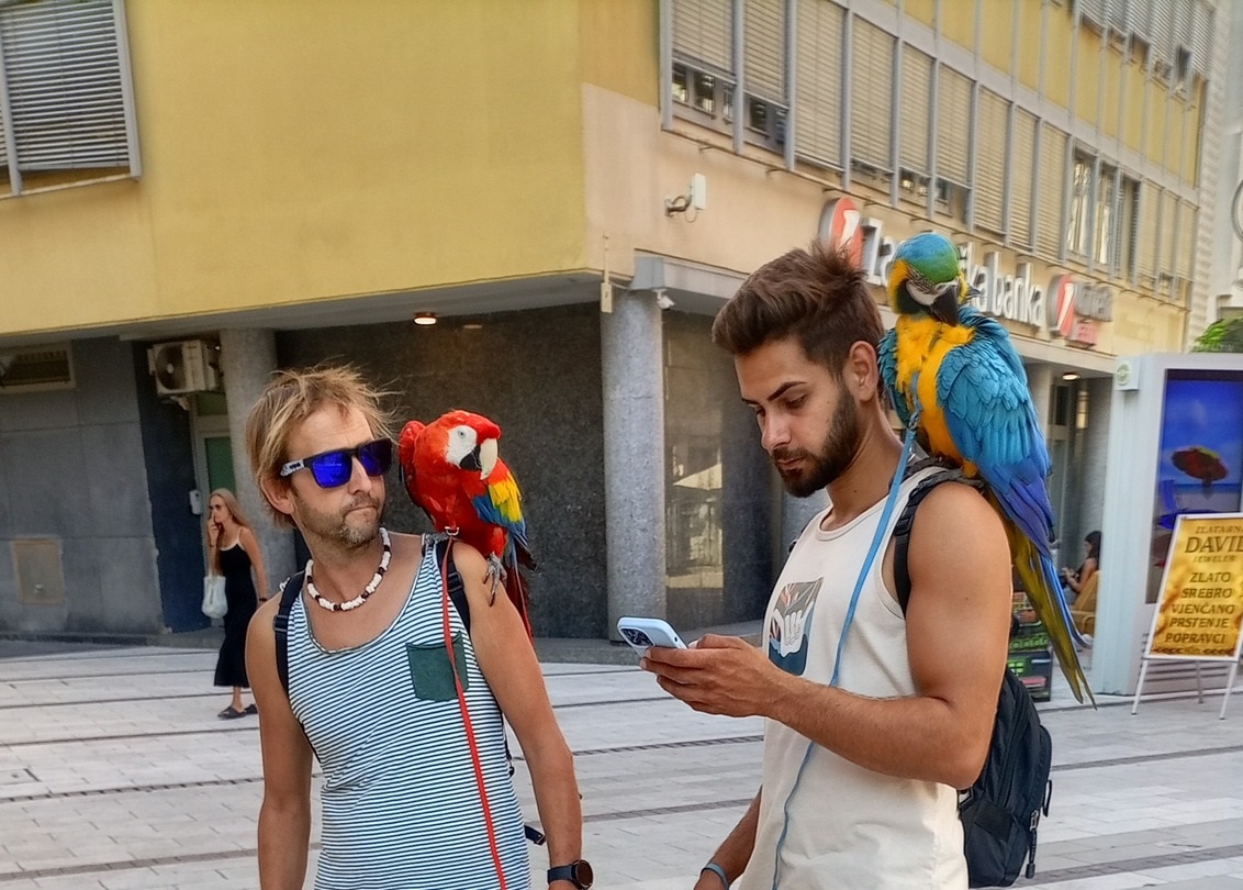 Dvojica turista izazvala su pravu senzaciju na Korzu kada su se pojavili s južnoafričkim papigama na ramenima.
