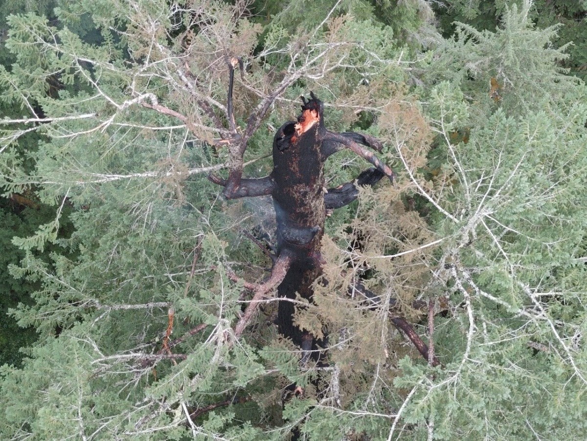 Prema riječima Megan Harper, glasnogovornice Saveznog ureda za upravljanje zemljištem, pregled infracrvenim dronom u utorak pokazao je da na vrhu stabla više nema aktivnog plamena ni dima. Međutim, detektirana je toplina unutar šupljine debla na visini od 85 metara, što znači da opasnost još uvijek nije prošla. Harper je potvrdila kako je stablo već izgubilo značajan dio visine, objašnjavajući da je vrh potpuno izgorio.