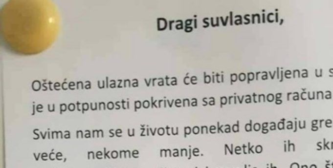 Premda se sve češće ne čini tako, među nama i dalje ima razumnih, susretljivih i dobrih ljudi. Ova poruka koja je osvanula u jednoj stambenoj zgradi to će vam savršeno dočarati.