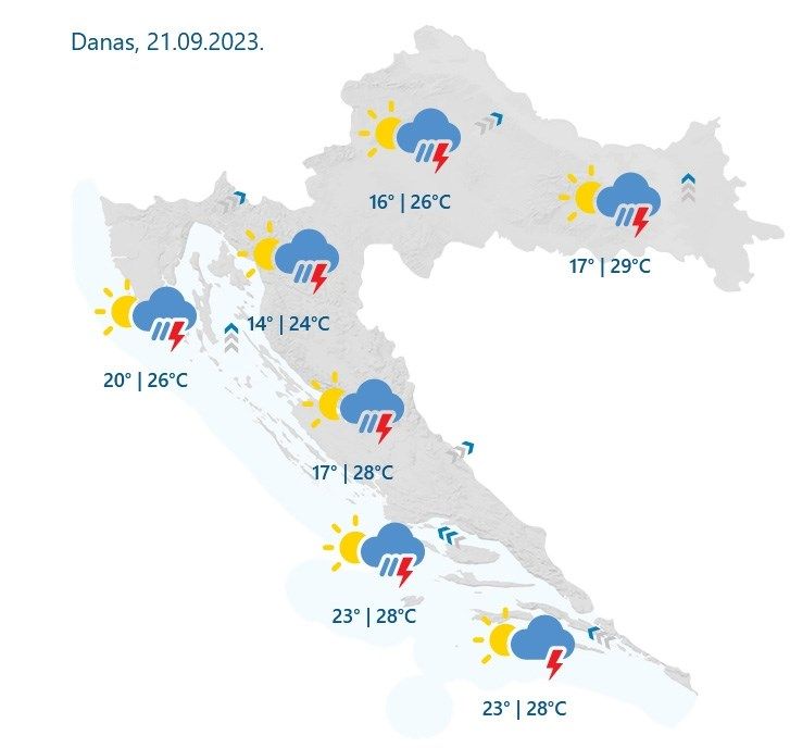 Prema prognozi DHMZ-a danas se očekuje promjenjivo oblačno sa sunčanim razdobljima i nestabilno. Mjestimice će biti kiša i pljuskovi s grmljavinom, češći i jači na Jadranu i u unutrašnjosti Dalmacije, lokalno moguće izraženi.