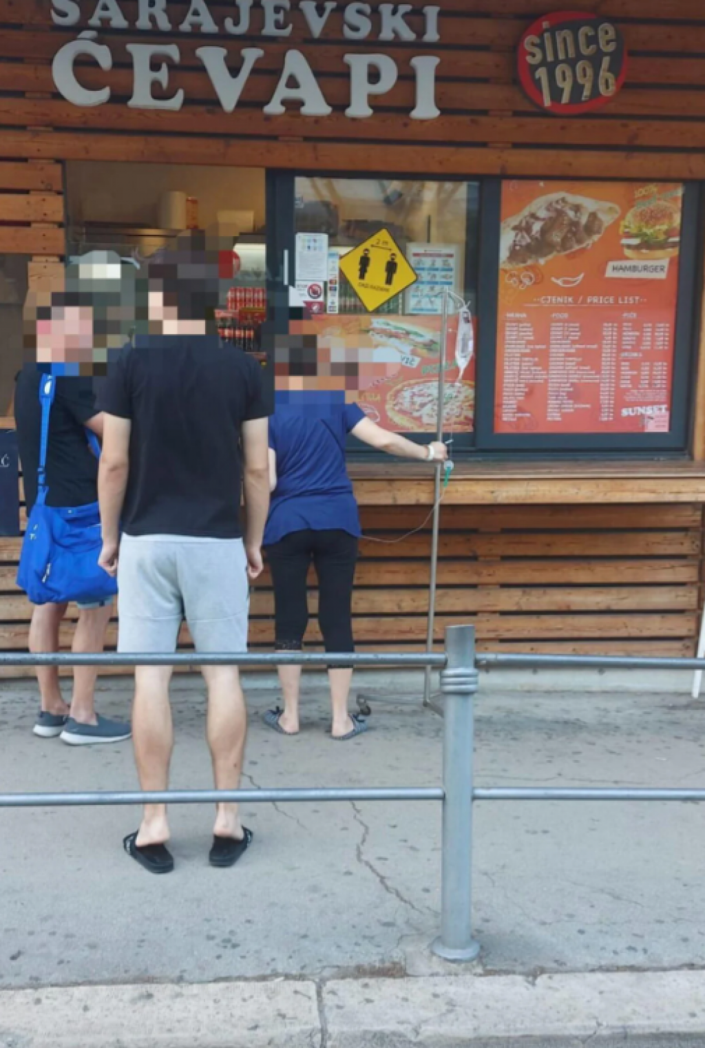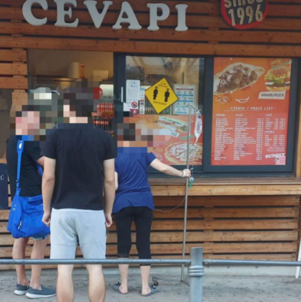 Žena u kućnim papučama, u tri kvarta hlačama, majici kratkih rukava mirno, bez imalo stresa nešto naručuje. Isto kao da je to normalno. Glad ne pita za infuziju, a poznavajući kako kvalitetnu hranu i obilate obroke dobivaju pacijenti u hrvatskim zdravstvenim ustanovama i nije čudo da je ova pacijentica malo pobjegla.