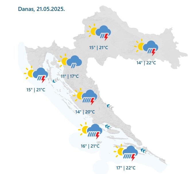Hrvatsku danas očekuje nastavak nestabilnog i promjenjivog vremena, prema najavama Državnog hidrometeorološkog zavoda (DHMZ). Povremena kiša, lokalni pljuskovi i grmljavina obilježit će vremenske uvjete u većini krajeva.