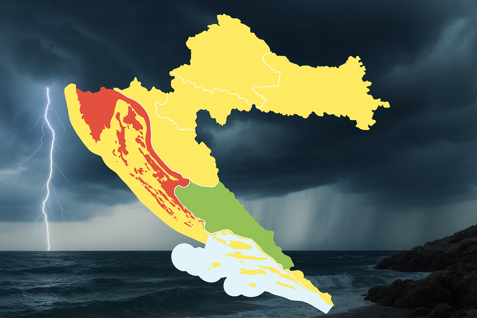 Za riječku regiju izdano je crveno upozorenje zbog izuzetno opasnog vremena, dok su ostatak zemlje i otoci pod žutim upozorenjima zbog kombinacije vjetra, grmljavine i visokih temperatura. Jedina regija bez upozorenja je kninska.
