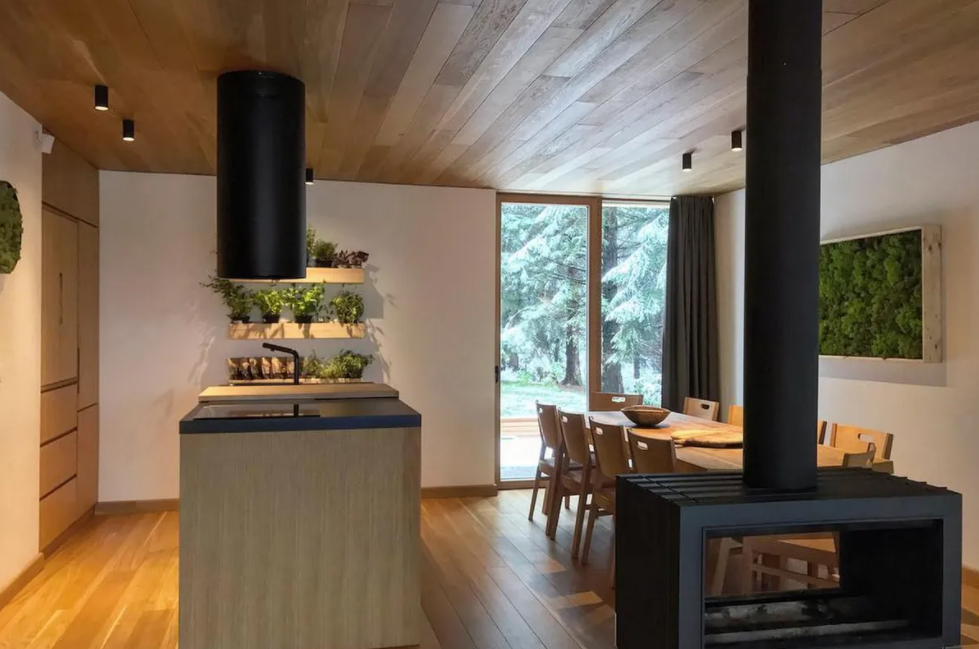 U kuhinji se nalazi stol za desetero ljudi, dok su na prvom katu spavaće sobe. “Na katu su tri spavaće sobe i svaka ima svoju kupaonicu. Ona najveća kroz stakleni zid ima pogled na šumu. U dvorištu su, pak, vanjski kamin, roštilj, otvorena blagovaonica i vrt”, stoji u opisu kuće.