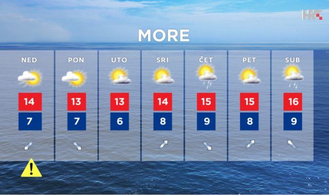 Na Jadranu sunčano na jugu, a promjenjivo oblačno sa sunčanim razdobljima na sjevernom dijelu. Povremene kiše, pretežno slabe, može biti veći dio tjedna, izglednije ipak od srijede, najčešće na širem riječkom području. Vjetar slab ili umjeren, sjeverozapadni i jugozapadni. Temperatura zraka u blagom porastu, i jutarnja i dnevna.”, navodi za HRT meteorolog Izidor Pelajić.