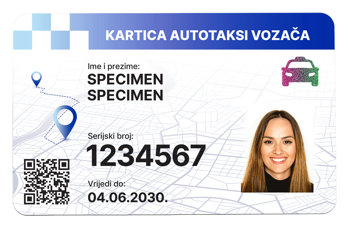 Kartica autotaksi vozača službeni je dokument koji svaki vozač mora imati tijekom vožnje, jasno istaknut u vozilu na vidljivom mjestu. Putnici tako u svakom trenutku mogu provjeriti identitet vozača, a inspektori ili druge ovlaštene osobe mogu jednostavno izvršiti nadzor. Kartica sadrži QR kod za provjeru valjanosti i ključne podatke o vozaču, čime se dodatno podiže razina sigurnosti i povjerenja u autotaksi prijevoz.