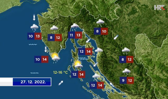“Samo u srijedu i četvrtak jutra će na kopnu biti hladnija od ostalih dana, mjestimice uz maglu. No, prema vikendu uz jugozapadnjak ponovno toplije, pa bi na Silvestrovo i Novu godinu dnevna temperatura ponegdje mogla opet biti iznad 15 °C. Izmjenjivat će se oblačna i sunčanija razdoblja, uz svakodnevno moguću kišu, ali samo mjestimice, povremeno i uglavnom u malim količinama, najčešće u gorju i na sjevernome Jadranu. Puhat će jugo – umjereno, povremeno i jako, a u utorak navečer na sjevernom dijelu samo prolazno bura.”, kaže za HRT meteorologinja dr. sc. Petra Mikuš Jurković.