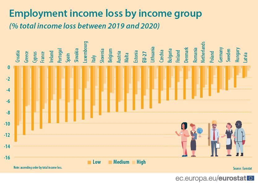 Procijenjeni gubitak dohotka na razini Europske unije malo je viši od 5% u ovoj godini u odnosu na prošlu. Vlade u državama Europske unije, među njima i Hrvatska, poduzele su kratkoročne mjere kako bi se sačuvala radna mjesta, a to je pridonijelo ublažavanju pada dohotka, ističu u Eurostatu.