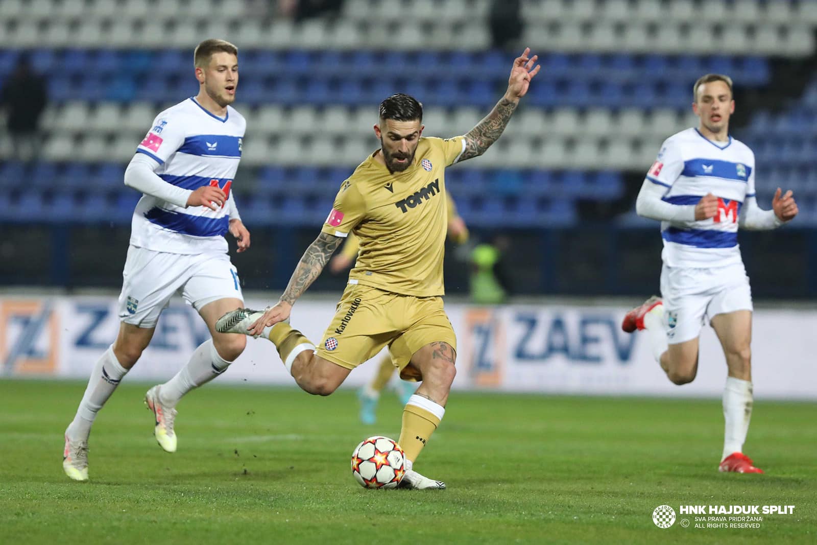 Pripadnici navijačke skupine Torcide, smješteni na sjevernoj tribini, u 34. minuti potrgali su osam sjedalica i ubacili ih na tartan-stazu. Nadalje, u 71. minuti upalili su 22 baklje i 3 stroboskopa, od čega su petnaest baklji i jedan stroboskop ubacili na tartan-stazu.