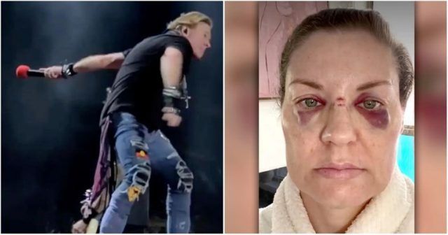 Žena iz Adelaidea u Australiji zaradila je modrice ispod očiju i na nosu nakon što ju je mikrofon koji je bacio pjevač benda Guns N’ Rosesa Axl Rose udario u lice.