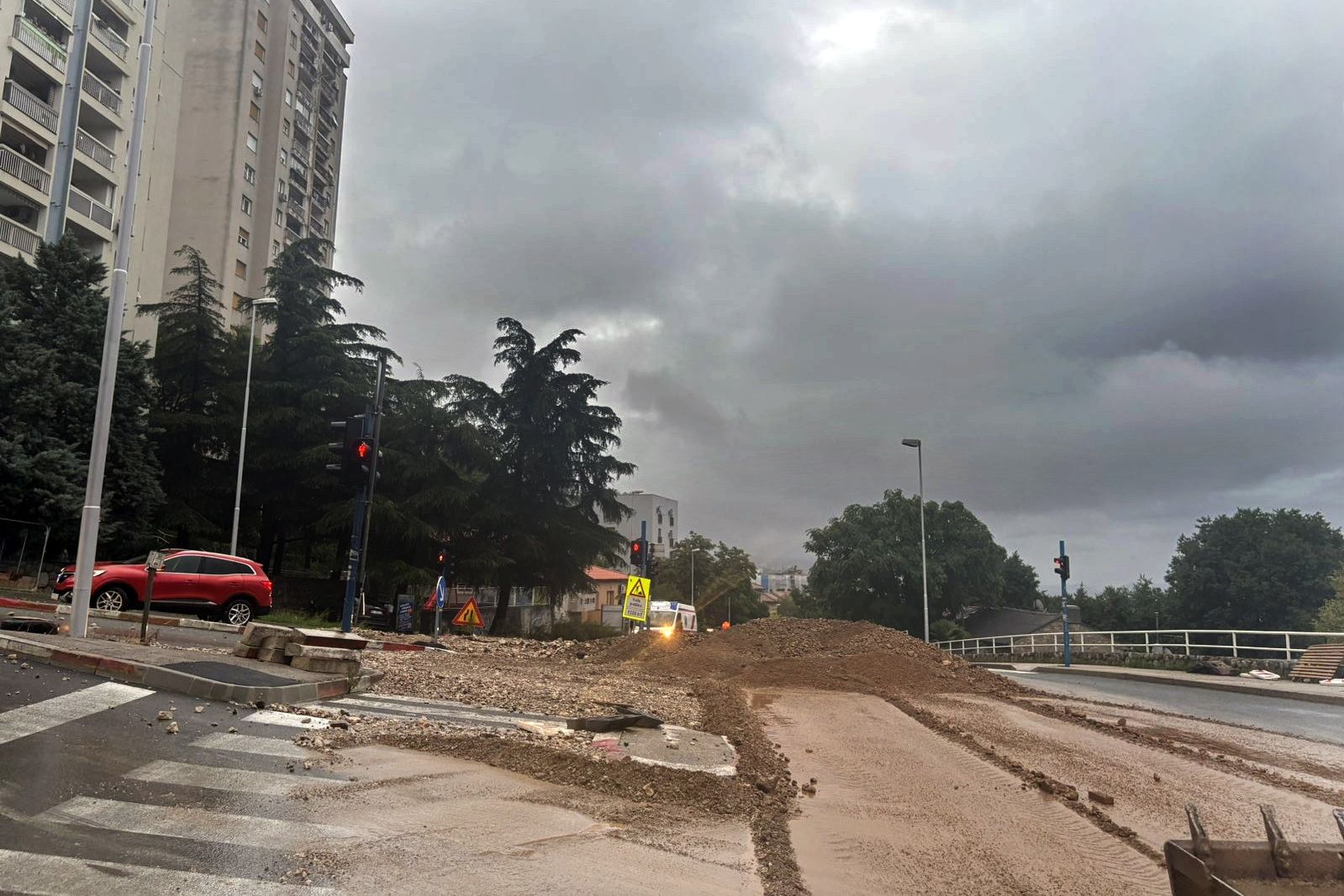 Poseban problem zabilježen je u Vukovarskoj ulici, gdje je došlo do odrona pijeska i kamenja s gradilišta koje se, prema prvim dojmovima, nije činilo adekvatno osigurano. Odron je izazvao dodatne poteškoće u prometu i otvorio pitanje sigurnosti gradilišta u ekstremnim vremenskim uvjetima.