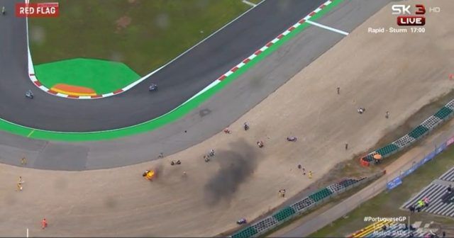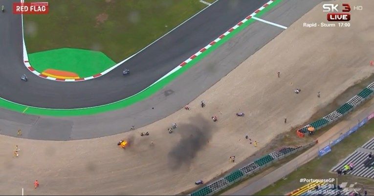Utrka klase Moto2, koja se danas vozila u Portugalu, prekinuta je 15 krugova prije kraja. Razlog prekida Velike nagrade Portugala jest to što su u istom zavoju izletjela čak osmorica vozača, a jedan se motor i zapalio. Srećom, svi su vozači pri svijesti i u dobrom stanju.