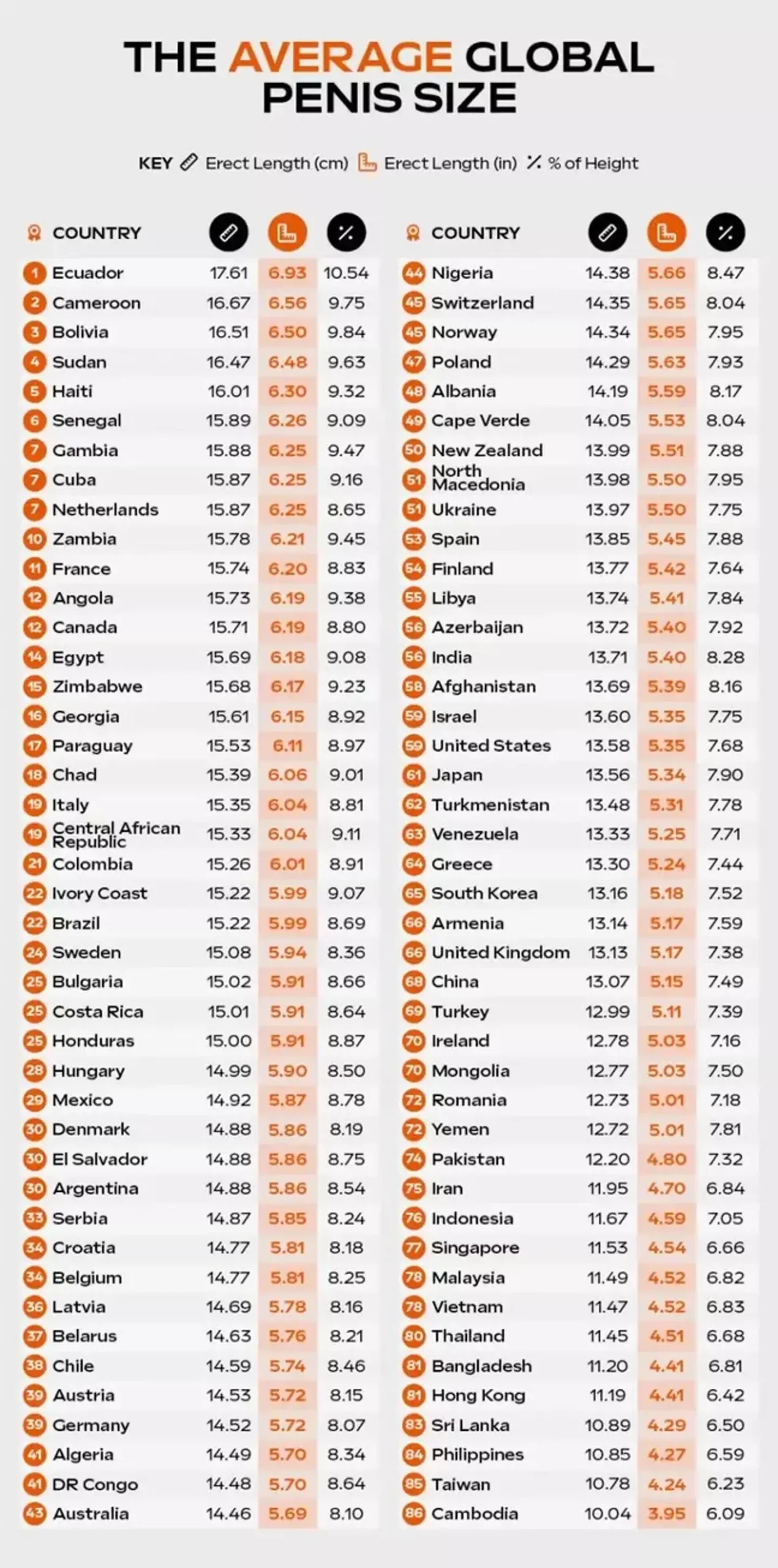 Online ljekarna NowPatient je nedavno otkrila koja zemlja ima najveću prosječnu veličinu penisa, koristeći Google podatke iz 80 zemalja. Prema njihovom istraživanju, muškarci iz Ekvadora imaju najviše razloga za ponos, s prosječnom veličinom od 17,6 cm u erekciji. To je otprilike 10% iznad prosječne duljine.