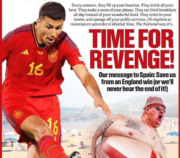 Oslanjajući se na praksu nekih škotskih navijača da navijaju za bilo koji tim koji igra protiv Engleske, naslovna stranica prikazuje kako španjolski reprezentativac Rodri nogom udara debelogog navijača Engleske koji je photoshopiran tako da ima oblik nogometne lopte.