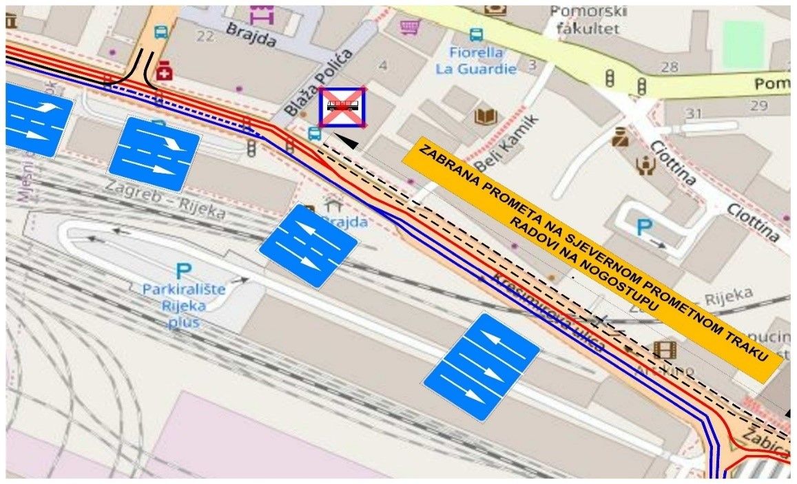 Prva faza nove privremene prometne regulacije zabranjuje promet kroz krajnje sjeverni prometni trak, od Trpimirove ulice preko nadvožnjaka do križanja Krešimirove ulice s Ulicom Blaža Polića. Ukida se stajalište Brajda, pored Indexa.
