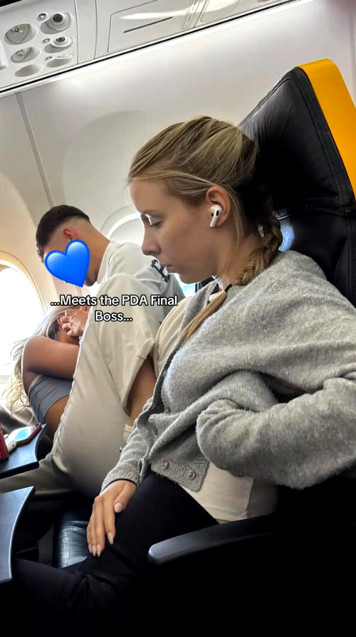 Na fotografijama se vidi njegova djevojka kako pokušava ignorirati prizor dok pored nje par leži jedno preko drugoga. Žena je bila naslonjena na partnera, a noge su joj bile ispružene prema prolazu i na naslonu sjedala — što je izazvalo posebno negodovanje drugih putnika.
