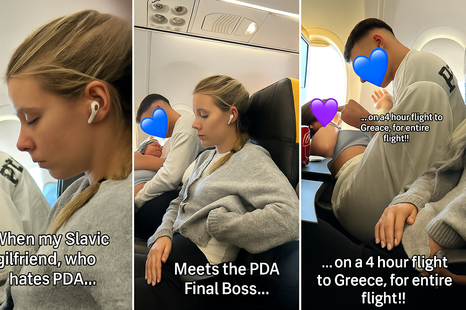 “Kad moja slavenska djevojka, koja mrzi javno iskazivanje nježnosti, sretne šefa javnog iskazivanja nježnosti… na četverosatnom letu za Grčku – cijeli let!!”