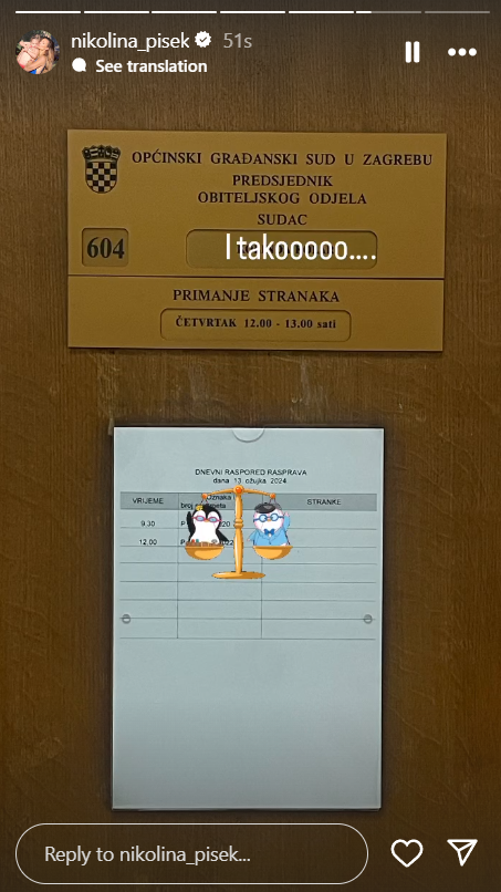 Nakon što su srpski mediji prenijeli navodnu tvrdnju njenog svekra, Miše Grofa, da je “povukao sve tužbe protiv nje”, Nikolina Pišek, poznata voditeljica, odlučila je staviti stvari u javni kontekst. Na svom profilu na društvenoj mreži, objavila je fotografiju sa suda, jasno signalizirajući da su situacija i njen odnos sa zakonom u fokusu.