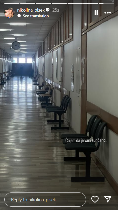 “I takooo…”, napisala je voditeljica uz fotografiju s Općinskog suda u Zagrebu, točnije s Obiteljskog odjela. “Čujem da je vani sunčano”, dodala je uz fotografiju iz čekaonice, možda aludirajući na svoju želju za jasnijim nebeskim horizontom u svom životu.