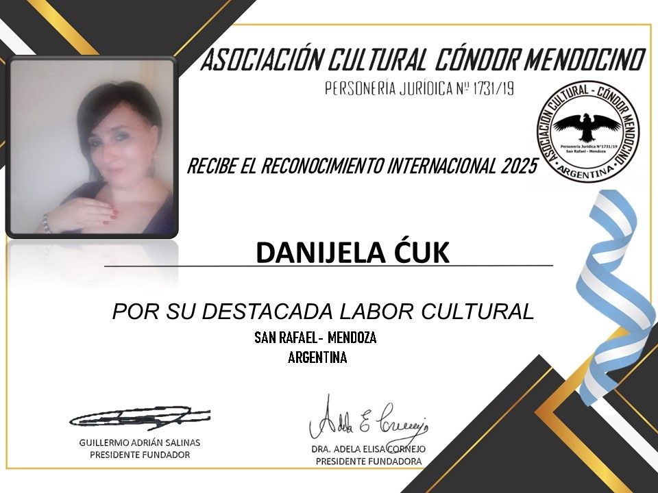 Hrvatska pjesnikinja i humanitarka Danijela Ćuk sa Čavli dobitnica je prestižnog Međunarodnog priznanja za kulturu koje dodjeljuje Kulturna udruga Medocino Kondor iz Argentine, pod predsjedništvom Adela Elisa Cornejo.