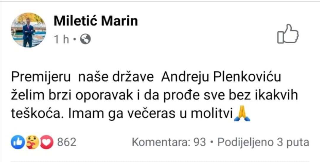 Tim povodom se javnosti osjetio potrebu obratiti bivši vjeroučitelj, aktualni saborski zastupnik i budući kandidat za riječkog gradonačelnika Marin Miletić: Premijeru naše države Andreju Plenkoviću želim brzi oporavak i da prođe sve bez ikakvih teškoća. Imam ga večeras u molitvi, stoji u Miletićevoj objavi na facebooku.