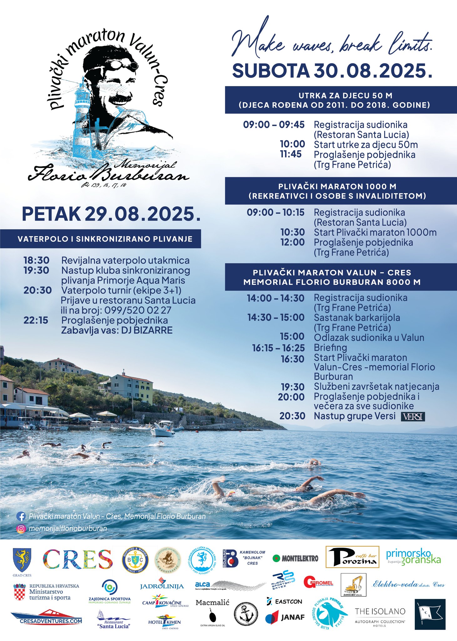 Najznačajniji dio događanja je 6. plivački maraton “Valun – Cres Memorijal Florio Burburan”. Utrka duga 8 kilometara starta u 16:30 sati iz slikovitog mjesta Valun, a cilj je na creskoj rivi.