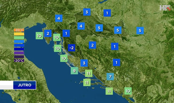 Podjednako toplo i na pretežno sunčnom sjevernom dijelu Jadrana na kojem će vjetar osobito u prvom dijelu dana gotovo posve izostati pa bi ponegdje moglo biti sumaglice i magle. Popodne do umjeren jugozapadnjak, izraženiji u gorskim predjelima u kojima će prevladavati vedro, a ujutro i hladno s najnižom temperaturom zraka u kotlinama i do -2 °C. Pretežno vedro uz ponedje umjeren jugozapadnjak bit će i u središnjoj Hrvatskoj. Ujutro oko 4 °C, danju od 21 do 23 °C. U Slavoniji, Baranji i Srijemu prevladavat će sunčano. Popodne u Posavini malo oblaka. Većinom mirno, rijetko gdje slab jugoistočnjak. Najniža temperatura od 3 do 6 °C, a najviša od 21 do 23 °C.”