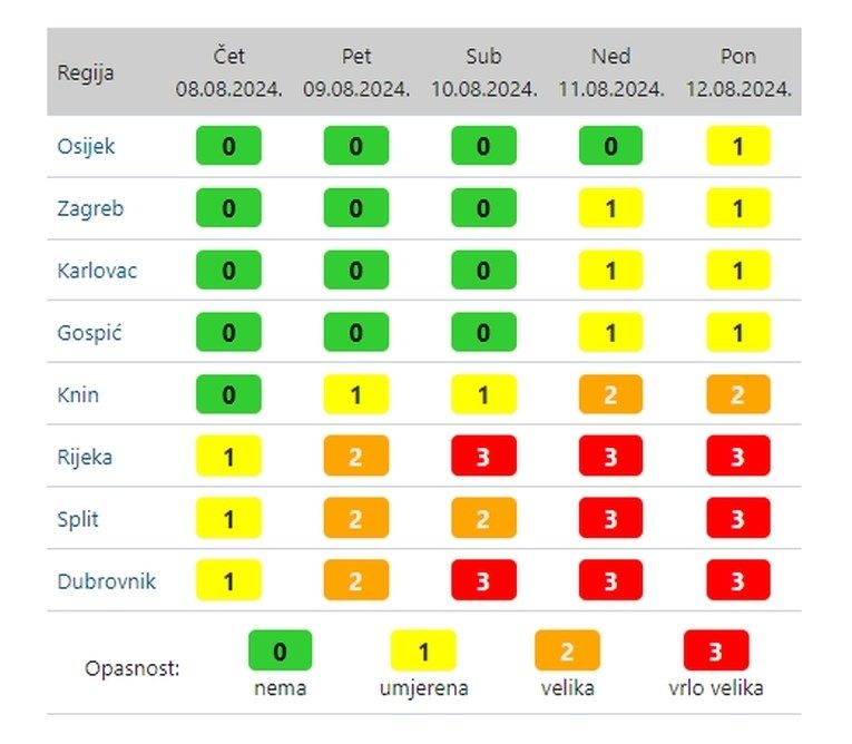 Za dijelove Hrvatske izdana su upozorenja za toplinski val. Narančasto upozorenje na snazi je za riječku, splitsku i dubrovačku regiju, dok je žuto upozorenje izdano za kninsku regiju. Meteorolozi predviđaju da će se toplinski val nastaviti do sredine idućeg tjedna, s vrhuncem početkom tjedna.