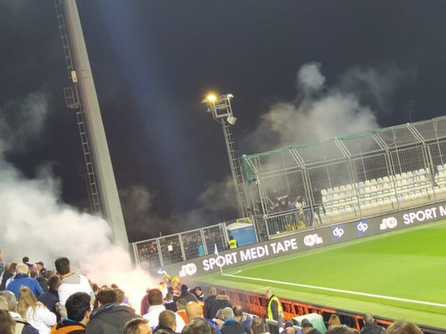Stoti Jadranski derbi obilježila je iznimno napeta atmosfera na tribinama. Osim dva incidenta s utrčavanjem navijača s istočne tribine u prvom poluvremenu i zapadne tribine tribine nakon utakmice, zabilježeno je i divljanje Torcide u kavezu na južnoj tribini.