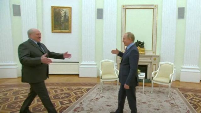 Na snimci, snimljenoj 18. veljače, neposredno prije početka njegove invazije na Ukrajinu, vidi se kako u Kremlju dočekuje svog bjeloruskog kolegu Aleksandra Lukašenka.