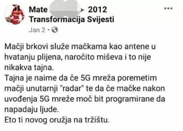 Home Mozaik Pojavila se nova teorija zavjere o 5G mreži, ima veze s mačjim... Mozaik Pojavila se nova teorija zavjere o 5G mreži, ima veze s mačjim brkovima! By dš - February 1, 2021 0 FacebookTwitterPinterestWhatsAppTelegram U jednoj Facebook grupi oglasio se čovjek po imenu Mate koji ima vrlo zanimljivu teoriju zavjere oko toga što se zapravo namjerava postići prelaskom na 5G mrežu. Teorija zavjere oko 5G mreže je puno, ova je definitivno jedna od najboljih!