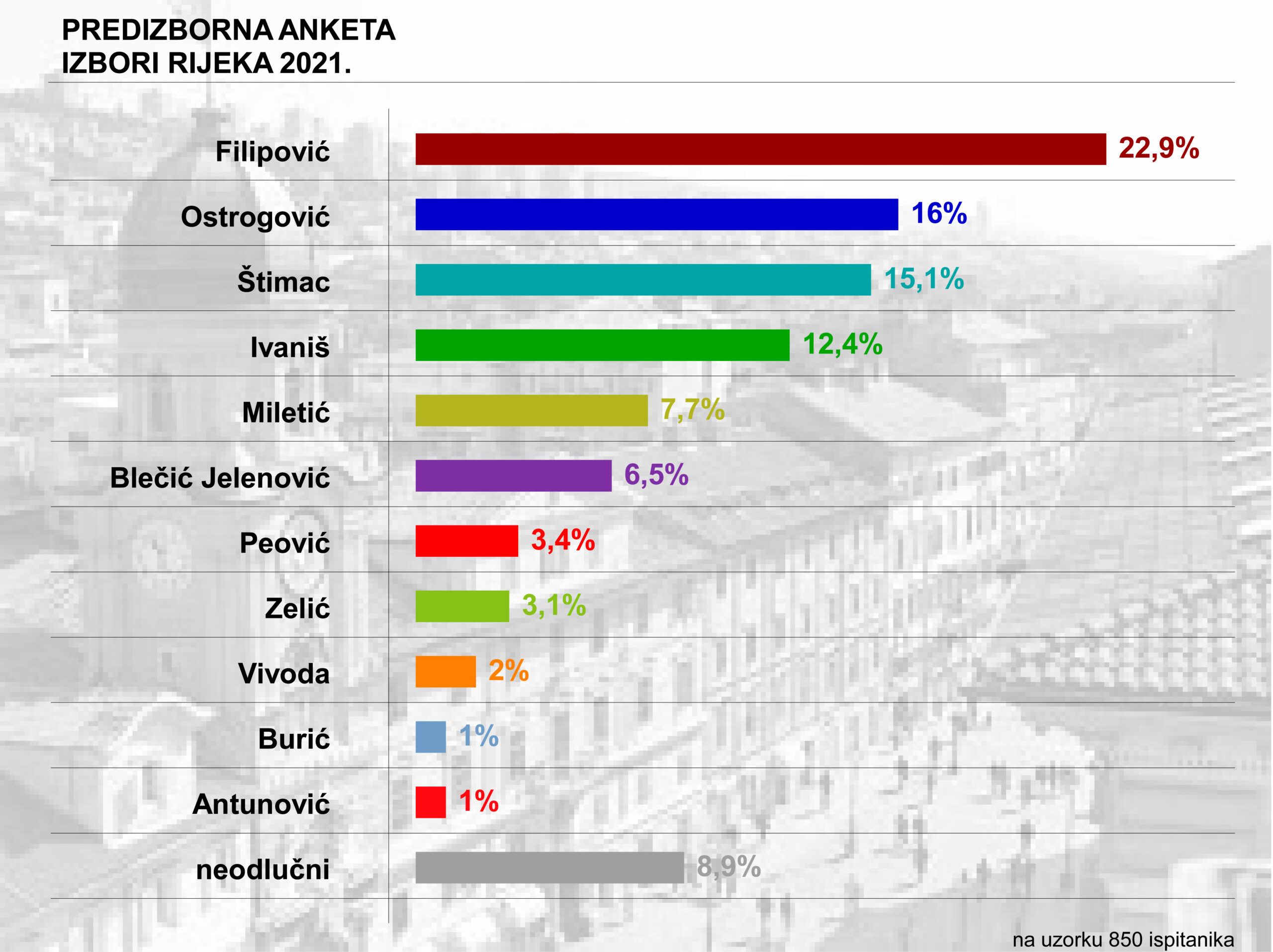Marko Filipović je najizgledniji kandidati za ulazak u drugi krug izravnih izbora za gradonačelnika Rijeke. Pokazuje to istraživanje preferencija birača provedeno od 10. do 12. svibnja na cijelom području Rijeke na 850 ispitanika, koje objavljuje kvarnerski.com. Prema tom istraživanju, Filipović odnosi otprilike 22,9 posto glasova, Ostrogović je na 16 posto. Slijedi Štimac s 15,1%, Ivaniš s 12,4 i Miletić sa 7,7%. Na šestom mjestu je Ana Blečić Jelenović sa 6,5 posto.