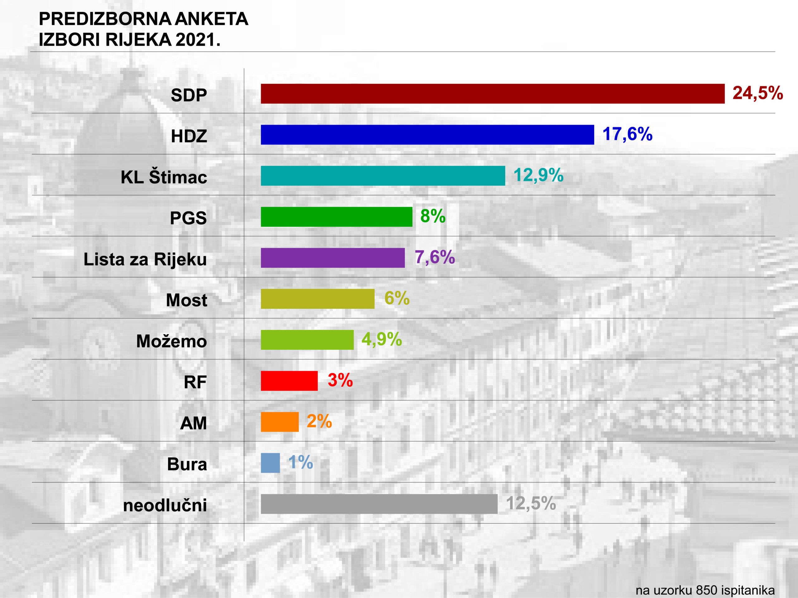 Kada je u pitanju Gradsko vijeće SDP-ova koalicija ima 24,5 posto ispred HDZ-a koji ima 17,6 posto. Nezavisna lista Davora Štimca ima 12,9 posto ispred PGS-a s 8%, Liste za Rijeku sa 7,6% i Mosta koji ima 6%. Možemo je na rubu izbornog praga s 4,9 posto, a sve ostale opcije nemaju izgleda za ulazak u Gradsko vijeće. Čak 12,5 posto birača je još uvijek neodlučno pa su promjene moguće sve do samog izbornog dana.