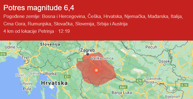 Snažan potres pogodio je Hrvatsku, epicentar potresa magnitude 6,3 je bio kod Petrinje, ali jako se osjetio u cijeloj Hrvatskoj pa i u sjevernoj Italiji.