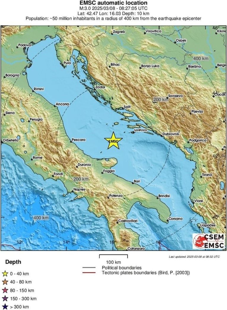 Home Vijesti Potres u Jadranskom moru! Vijesti Potres u Jadranskom moru! By dš - March 8, 2025 0 FacebookTwitterPinterestWhatsAppTelegram 83a91052 4ead 4652 8131 d39690cd4e06 U Jadranskom moru je u 9 sati i 27 minuta zabilježen potres magnitude 3.3. EMSC javlja da je epicentar potresa bio 46 kilometara jugozapadno od Vele Luke na Korčuli. 33cef78f f088 4239 ab5f 596a646d9bd7