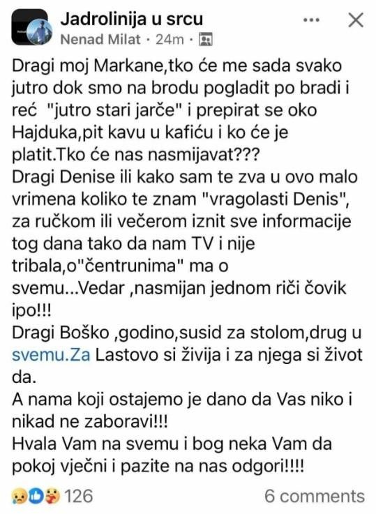 “Dragi moj Markane, tko će me sad svako jutro dok smo na brodu pogladit po bradi i reć ‘jutro, stari jarče‘ i prepirat se oko Hajduka, pit kavu u kafiću i tko će je platit. Tko će nas nasmijavat???