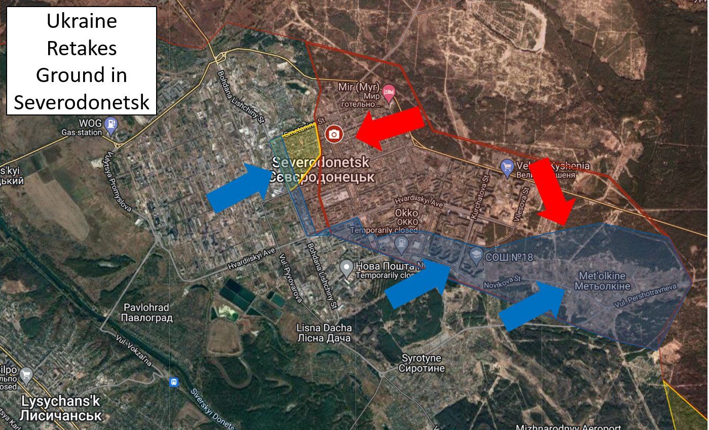 #Severodonetsk – In a surprise move, #Ukraine has reinforced the city with heavily armed troops and the #UAF foreign legion & counterattacked #Russian Forces. #UAF has reportedly recaptured 20% of the city & Metolkine to the E. This was first reported by pro-#RuAF sources. pic.twitter.com/Crsq6Po42p