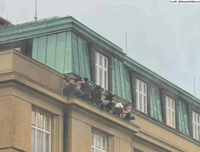 U četvrtak, u satima nakon oružanog napada na sveučilištu u Pragu, u Češkoj, u kojem je ubijeno 14 osoba. Fotografija na kojoj vidimo skupinu studenata kako čuče na izbočini sveučilišnih prostorija obišla je društvene mreže. Pokušali su se skloniti od strijelca (kojeg je policija pronašla mrtvog nekoliko minuta nakon završetka napada). Fotografija je u petak objavljena na naslovnici nekoliko europskih novina, uključujući i londonski Times.
