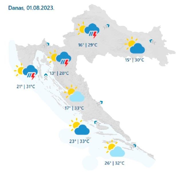 “Postupan porast naoblake sa zapada. Kasno popodne se ponajprije na sjevernom Jadranu i sjeverozapadu unutrašnjosti očekuje mjestimična kiša i pljuskovi s grmljavinom, lokalno moguće jače izraženi, a navečer i u noći na srijedu proširit će se na istok i jug. Vjetar većinom umjeren jugozapadni i jugoistočni, navečer uz pljuskove prolazno jak sjeverni. Na Jadranu južni i jugozapadni u okretanju na jugo. Najviša dnevna temperatura zraka od 27 do 31, na moru od 30 do 33 °C”, piše DHMZ.