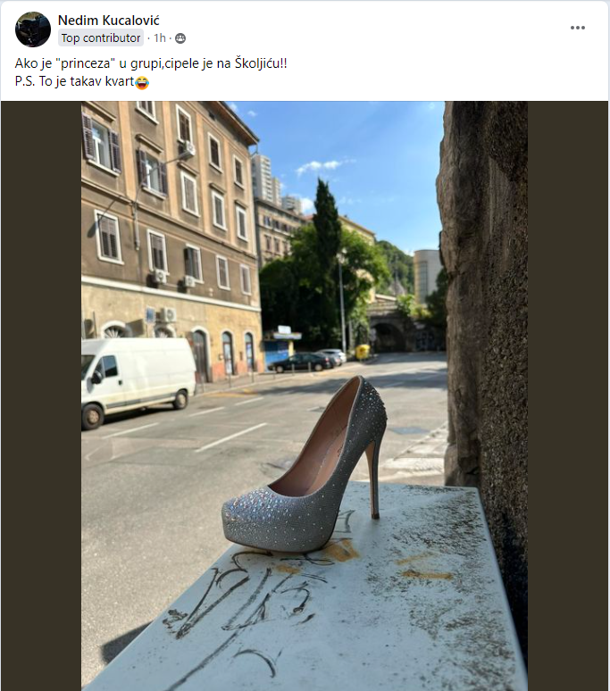 U živopisnom riječkom centralnom kvartu Školjić, dogodila se prava urbana bajka. Na Facebook stranici “Volim Grad Koji teče” osvanula je intrigantna fotografija elegantne štikle s porukom: “Ako je ‘princeza’ u grupi, cipele je na Školjiću!! P.S. To je takav kvart 😂.”