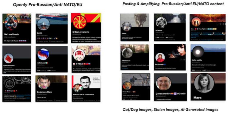 - AI-generirane profilne slike i slogani proruskog sadržaja.