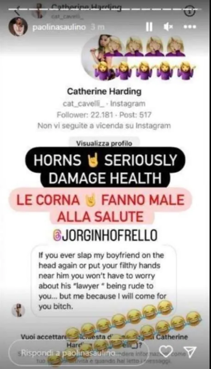 U svom storyju na Instagramu Saulino je pak stavila poruku: Rogovi su loši za zdravlje. Ta poruka nastavlja se na jedno nedavno gostovanje u talijanskoj radio-emisiji u kojoj je Saulino otvoreno rekla da je bila sa Jorginhom koji je s njome varao Harding…