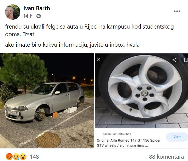 Puležan neće dobro pamtiti ovaj vikend koji je iskoristio kako bi posjetio prijatelja u Rijeci. S parkiranog automobila Alfa Romeo na parkiralištu kod Kampusa otuđeni su dijelovi i automobil više nije u voznom stanju!.